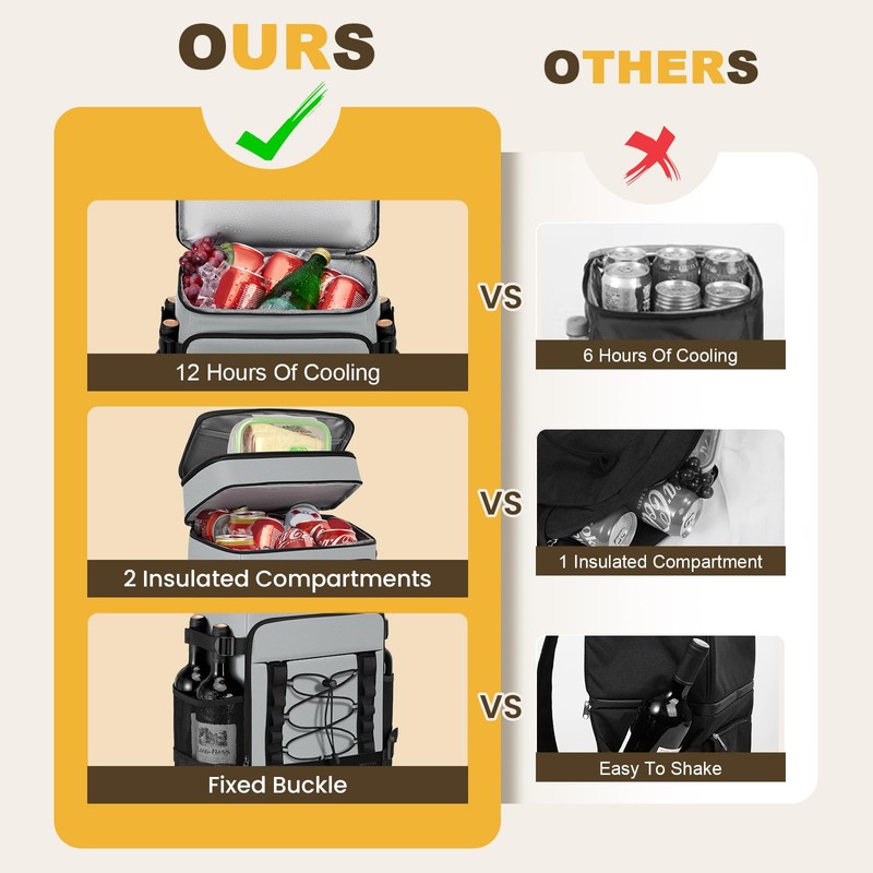 - TWO COMPARTMENTS DESGIN: The large capacity picnic backpack with 2 compartments can hold up to 40 cans (330ml). Featured 2 compartments for cooling drinks & dry food
