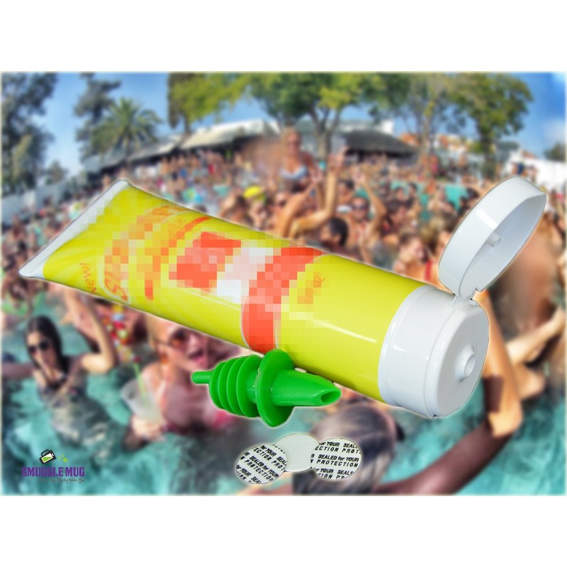 - Sunscreen 12.8oz Flask comes with 3 lid peel off seals keeps it leak and smell proof