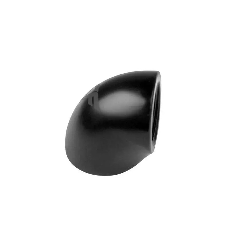 Black adaptor with two 1/4 inch inner threads; the adaptor has an angle of 90°.