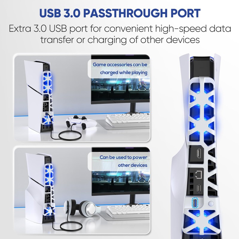 - ๐๐ข๐ ๐ก-๐๐ฉ๐๐๐ ๐๐๐ ๐.๐ ๐๐ฎ๐ ๐๐ง๐ญ๐๐ซ๐๐๐๐: This cooling fan for ps5 slim and Pro accessories features a USB 3.0 hub interface that supports data transfer rates of up to 5Gbps. It also provides a charging function, allowing you to power other devices while you play, adding to its versatility and convenience.