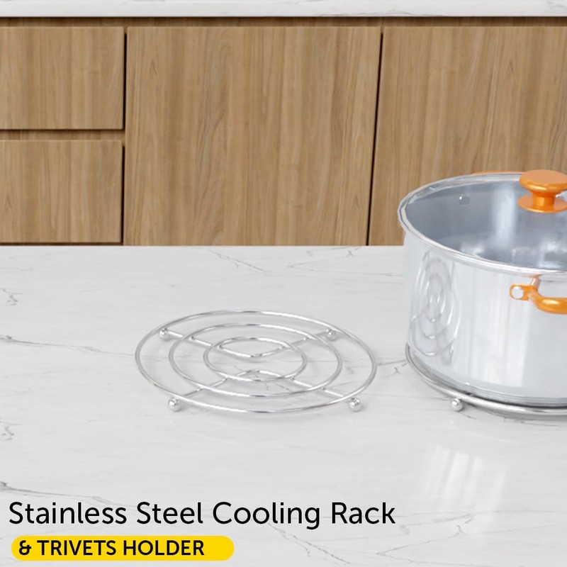 Cooling Rack Round Metal Trivets Holder Hot Pot Pan Cooking Stand Non-Stick Steaming Wire Rack for Kitchen Worktops Protector- Chrome