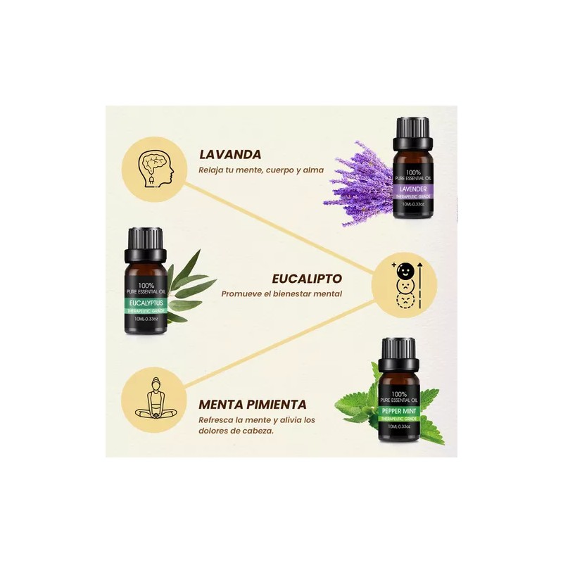 Variedad de Aromas : Cada aceite tiene propiedades terapéuticas específicas que ayudarán a equilibrar tu cuerpo y mente. Desde la relajante lavanda hasta la revitalizante menta, cada uno tiene su magia.