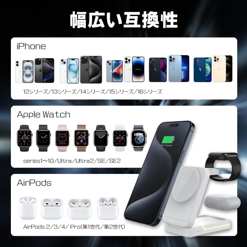 - 【Wide Compatibility】Compatible with iPhone 16/15/14/13/12 series (Pro Max/Pro/Plus/Mini), Apple Watch 10/9/8/7/6/5/4/3/2/1/Ultra/SE (1st Generation/2nd Generation), AirPods Pro (1st Generation), AirPods 4/3/2. Furthermore, it can charge all Qi-enabled Android smartphones. (Magsafe case or magnetic ring required)