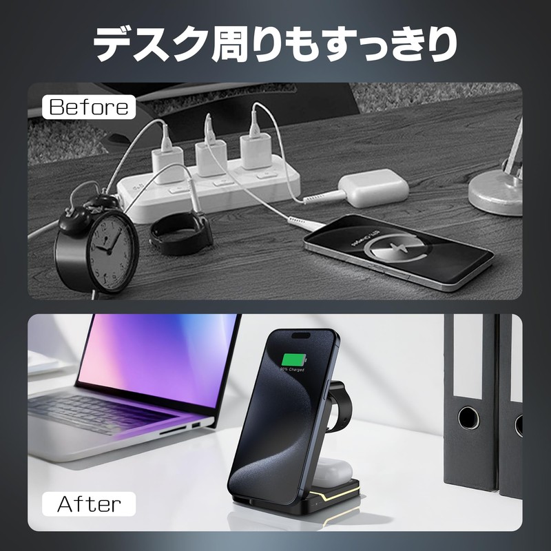 - (Simultaneous Charging of 3 Devices) Wirelessly charge 3 devices simultaneously. Eliminates the hassle of changing chargers for each device or using multiple cables, this 3-in-1 device will keep your desk or bedside organized. You don't have to worry about forgetting to charge it while working or sleeping