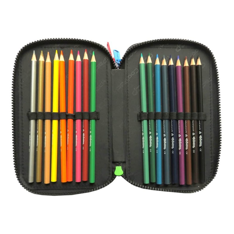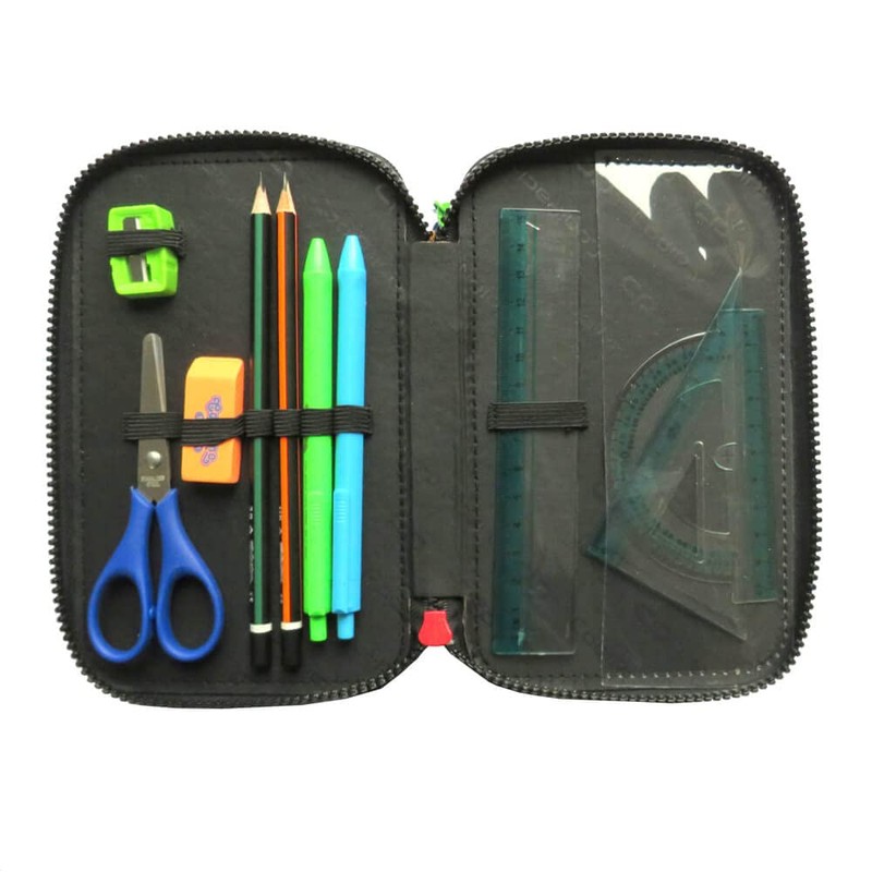 • Contents: 18 felt tip pens, 18 coloured pencils, 2 pencils, 2 pens, 1 ballpoint pen, scissors, eraser, sharpener, geometric set