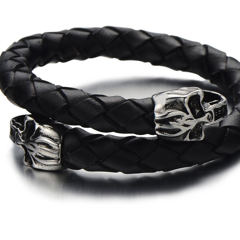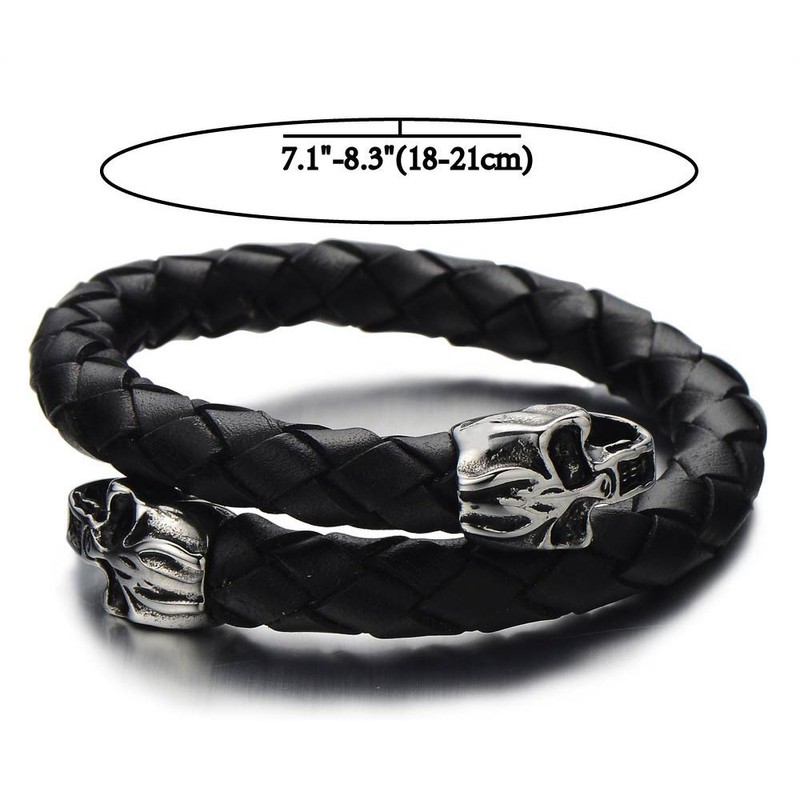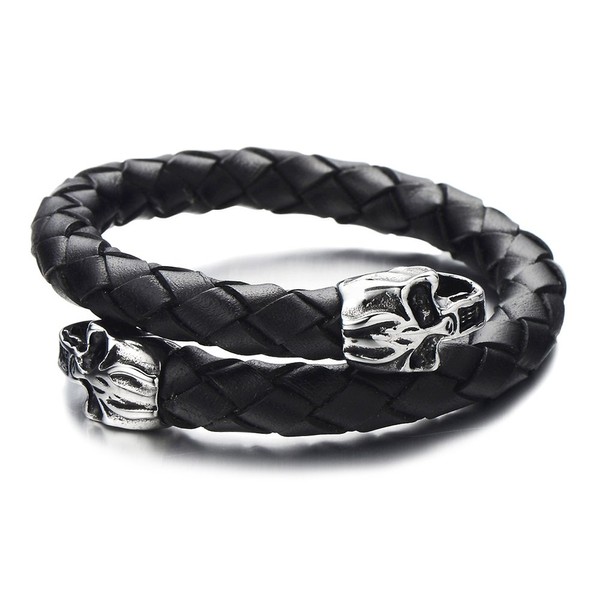 COOLSTEELANDBEYOND Elastic Adjustable Men's Black Braided Leather Wrap Bracelet Wristband with Steel Skull Silver Black