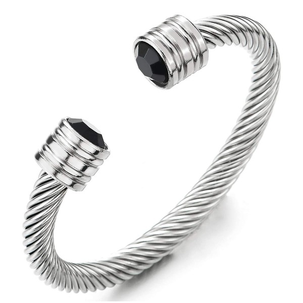 COOLSTEELANDBEYOND Men Women Steel Twisted Cable Cuff Bangle Bracelet with Black Cubic Zirconia, Adjustable(CA)
