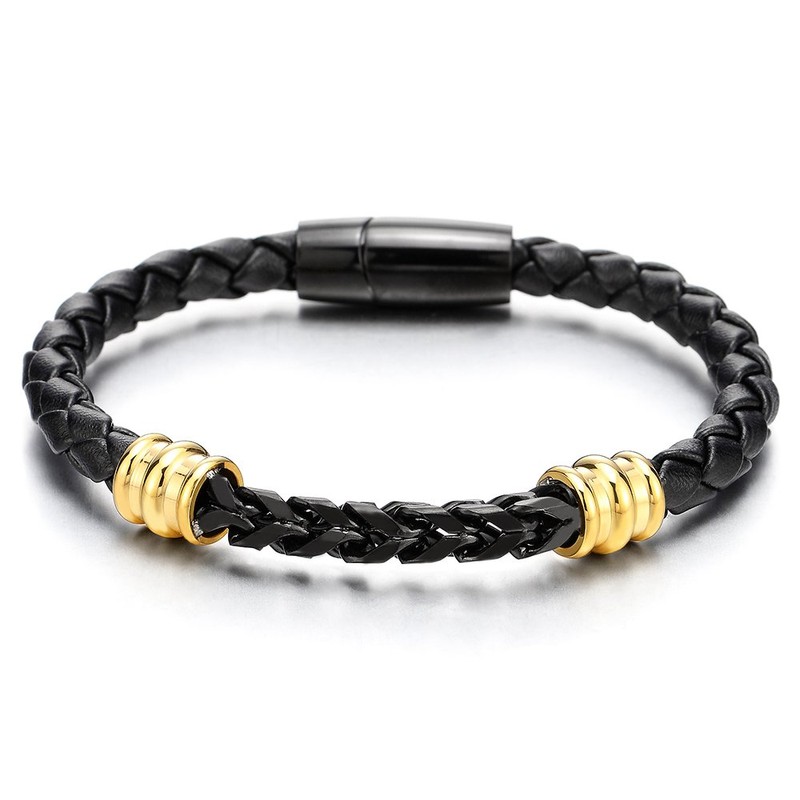COOLSTEELANDBEYOND Mens Stainless Steel Gold Black Square Franco Chain Curb Chain and Black Braided Leather Bracelet