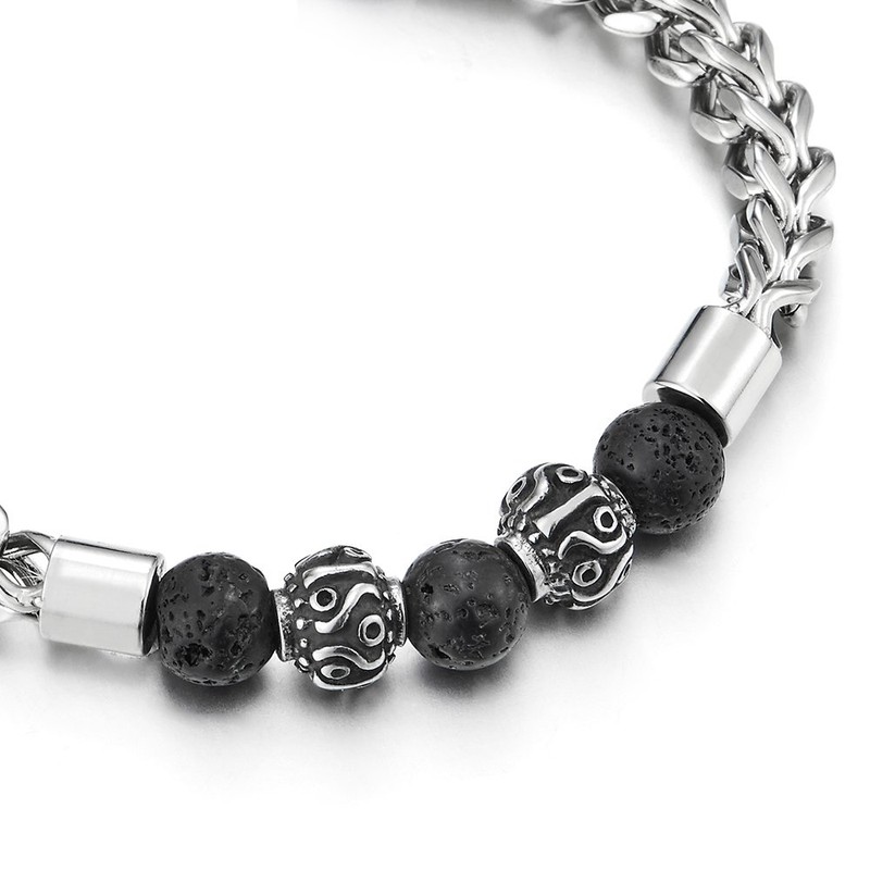 - Mens Women Elastic Franco Link Curb Chain Bracelet Steel Bead Black Volcanic Lava Rock Stone Beads