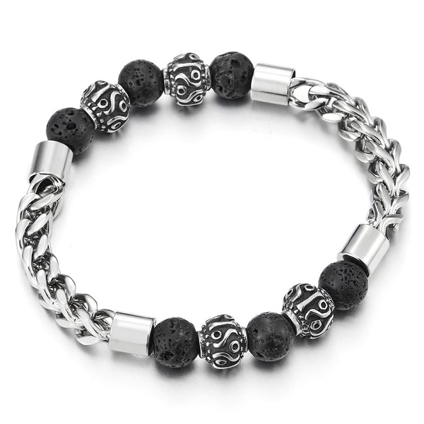 COOLSTEELANDBEYOND Mens Women Elastic Franco Link Curb Chain Bracelet Steel Bead Black Volcanic Lava Rock Stone Beads (CA)