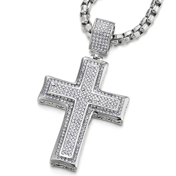- Mens Womens Large Steel Two-Layers Cross Pendant Necklace with Cubic Zirconia, 30 inches Wheat Chain