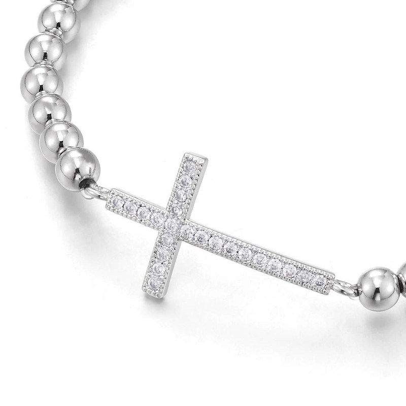 COOLSTEELANDBEYOND Womens Beads Link Chain Bracelet Cubic Zirconia Horizontal Sideway Cross, Exquisite(CA)