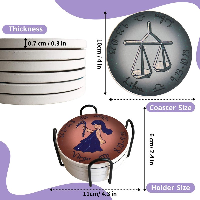 CoooolPrintz Limited Edition 4" Tabletop Ceramic Coaster Set of 6 with Holder-Assorted Zodiac Signs Collection-Elevate Your Drink Experience with The Best Absorbent Coasters! (Zodiac Sign II)