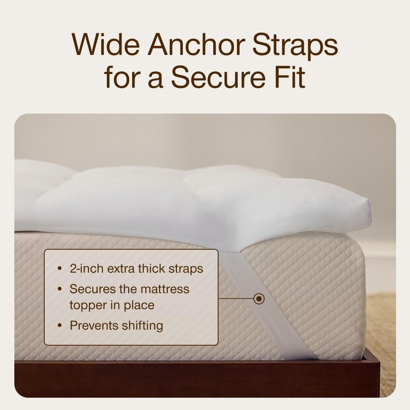 - Secure Fit & Easy Upkeep: Built-in elastic straps on each corner keep the topper attached to your mattress and firmly in place throughout the night – no shifting, sliding, or bunching. For best results, simply shake out the topper and fluff it by hand with each season to restore its plushness and extend its performance over time. To extend your mattress topper’s lifetime, we recommend pairing it with our Ultra-Tech Waterproof Mattress Protector to keep it clean and fresh. The Essence Mattress Topper is available in Twin, Twin XL, Full, Queen, King and Cal King to fit all mattress sizes.