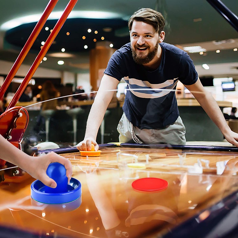 - Package includes: come with 4 air hockey pushers(contain blue, black, green, red), 4 green pads and 8 red pucks.