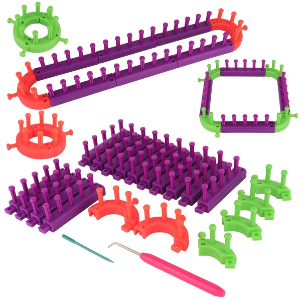 • [Various weaves with a flexible set]: the package includes 14 linear looms, 6 x bow looms part, 1 crochet hook and a large plastic needle. This adjustable loom set can assemble dozens of different looms. There are small socks for children, knitting boards for teenagers and large knitting machines. The number of knitting works depends on your imagination