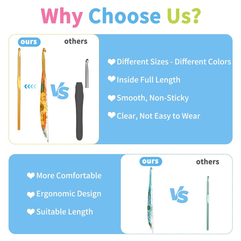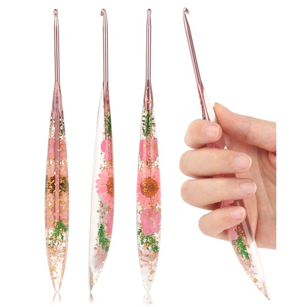 - [ Floral Resin Crochet Hook Grips ] Coopay ergonomic crochet hooks feature transparent resin grips that are more comfortable than silicone, easier to grip than metal, and more aesthetically pleasing than standard plastic. Additionally, crochet hooks are adorned with beautiful flowers, combining practicality with fashion, allowing you to fully enjoy your crocheting