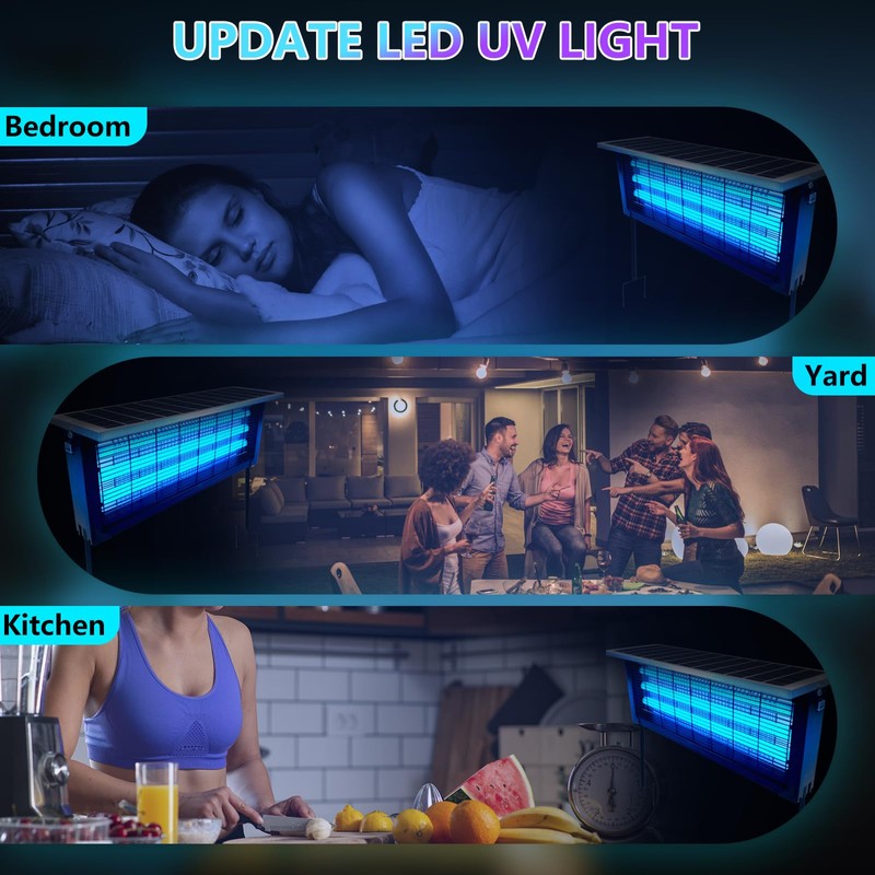 - 1.Three LED tubes. High quality glass solar panel. Powerful UV intensity can effectively control mosquitoes and insects within 3500 square feet. High quality glass solar panel has very high solar energy conversion efficiency.