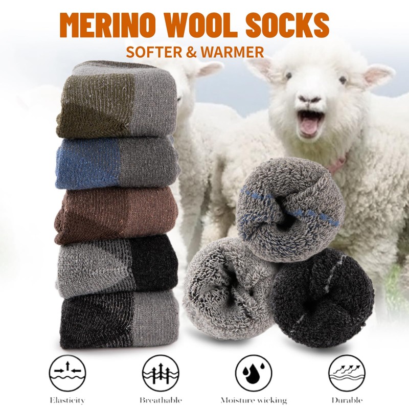 • THICK AND WARM MERINO WOOL SOCKS - COOVAN 5 Pairs of thermal socks for men are made of a high-quality merino wool and polyester blend which is thick, soft, comfortable, breathable, wear-resistant and sweat-wicking. Each pair of thick socks for men weighs up to 90 grams, thick and warm enough in the cold winter. One size fits most Mens Shoe Size 6-12(Sock Size 10-13).