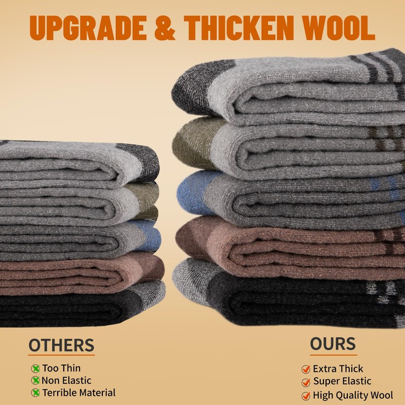 - THICK AND WARM MERINO WOOL SOCKS - COOVAN 5 Pairs of thermal socks for men are made of a high-quality merino wool and polyester blend which is thick, soft, comfortable, breathable, wear-resistant and sweat-wicking. Each pair of thick socks for men weighs up to 90 grams, thick and warm enough in the cold winter. One size fits most Mens Shoe Size 6-12(Sock Size 10-13).