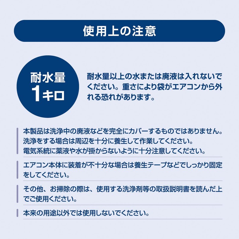 - Precautions for Use: Water resistant to 2.2 lbs (1 kg). Please do not fill water or waste liquid with more than water resistance. Depending on the weight, the bag may come off from the air conditioner. ・This product does not fully cover the waste fluid or other items during washing. When washing, please use the area to clean thoroughly. Please be careful not to expose liquid or water to your electrical system. If the unit is not sufficiently attached to the air conditioner, please fix it firmly with a protective tape. Do not use for anything other than the intended purpose. For other cleaning warnings, please read the instruction manual (English language not guaranteed)