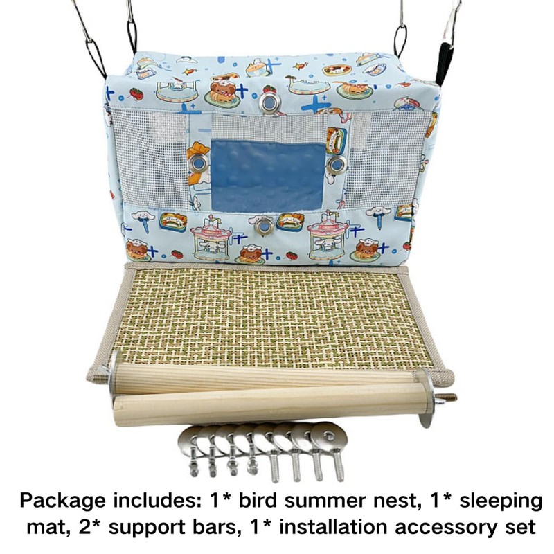 • Package includes: 1* bird summer nest, 1* sleeping mat, 2* support bars, 1* installation accessory set. 3 sizes, suitable for most of birds such as lovebird, budgie, conure, cockatiel, quaker, African grey, , Eclectus, etc.