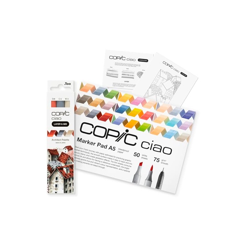 Copic Ciao Layer & Mix Starter Set Architect, Marker Set with 3 Different Colours, Marker Paper and Drawing Template for Tracing, Includes Learning Exercise Sheet