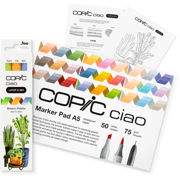 Copic Ciao Layer & Mix Starter Set Botanic, Marker Set with 3 Different Colours, Marker Paper and Drawing Template for Tracing, Includes Learning Exercise Sheet