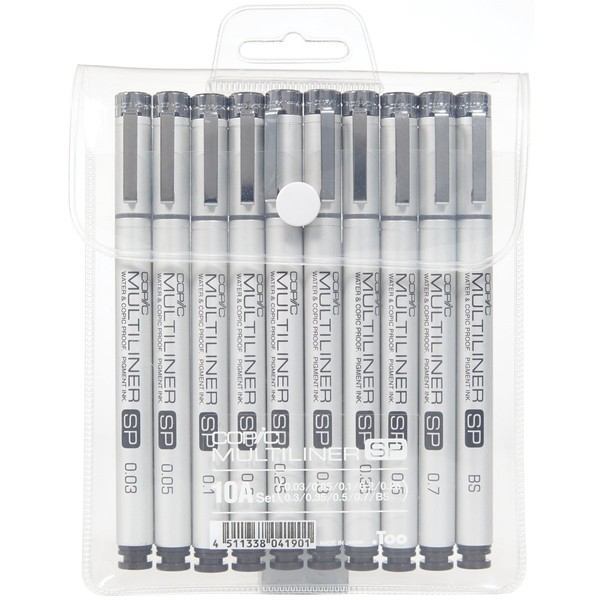 - This Package Contains Ten Black Multiliner Ink Pens in Sizes 003Mm, 005Mm, 01Mm, 02Mm, 025Mm, 03Mm, 035Mm, 05Mm, 07Mm and one Brush Tip