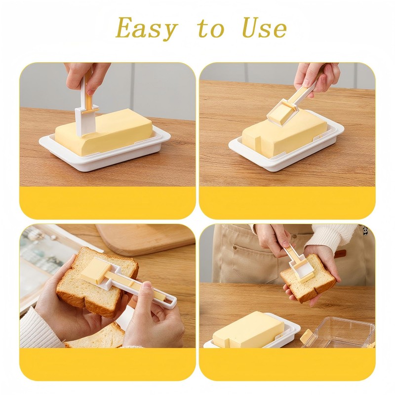 The butter dish comes with a spoon that makes it easy for you to know how much butter you're taking, and it's easy to use by simply scooping up and pushing the handle forward to scrape the butter onto things. Easy to slice and use as well as organize and store. Sealed storage, refuse to smell the refrigerator.