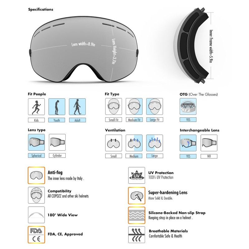 - ❤ Interchangeable Lens - There are many different replacement lenses available for G1 Ski Goggles. Perfect ski goggles to make your own combination for different light conditions. If you want to ski from day to night, it's better that you got two lenses to switch, please search COPOZZ G1 Replacement lens.