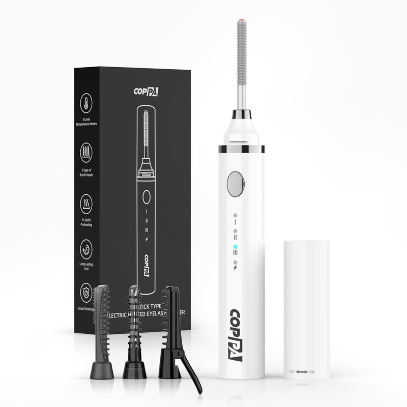 COPPA Beheizte Wimpernzange, LP-1 Lippenstift Typ 3-in-1 Beheizter Wimpernformer mit 3 Bürstenköpfen 3 Curling-Modi & 3 Temperature – 5s Aufheizen Perfekt für Anfänger und Makeup-Profis, Weiß