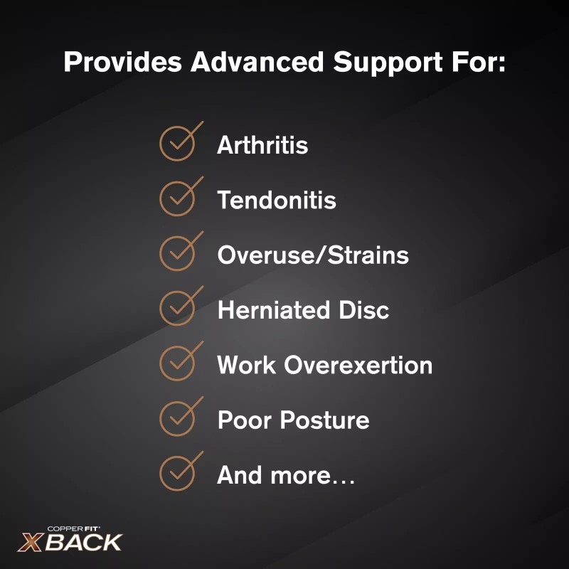 Say goodbye to back and lumbar pain and welcome unparalleled back support with the revolutionary Copper Fit X Back Brace. Crafted with cutting-edge technology, the new Copper Fit X-Back Support delivers dynamic support and premier stability. The Copper Fit X-Back features a state-of-the-art Lumbar Support Panel, Flexible Stabilizing Supports and a Customizable Power X Adjustable Strap System. The Lumbar Support Panel is engineered to replicate the natural curvature of your spine ensuring superior lower back support and stability. Moreover, the Power 'X' Adjustable Strap System enables dynamic support across a broader area while maximizing comfort. Constructed from lightweight, breathable materials, this dynamic back support allows for unrestricted movement, seamlessly fitting into your lifestyle and easily worn under clothing. Wear it when youre walking, working, lifting, bending, or stretching and enjoy freedom of movement! Experience the difference with our innovative, patent-pending support systemget Superior Back Support with Lighter than Air Comfort!
