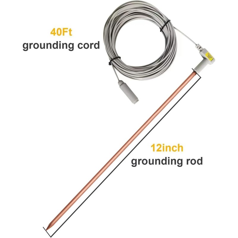 - This grounding set comes with everything you need: a 12-inch pure copper grounding rod, a 40ft female grounding cord, and a 15ft male grounding wire to easily connect to a grounded outlet or directly into the ground.