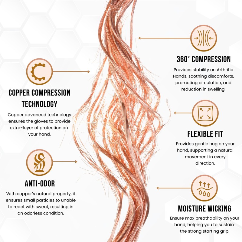 - [Copper Infused Compression Tech] - With our advanced copper compression technology, copper tech golf glove for men provide essential support to help reduce swelling, boost blood flow, and alleviate joint and muscle stiffness & soreness while golfing.