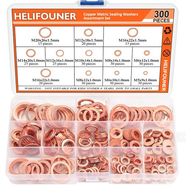 Copper Washer Assortment Set, HELIFOUNER 300 Pieces 12 Sizes Copper Metric Sealing Washers Kit