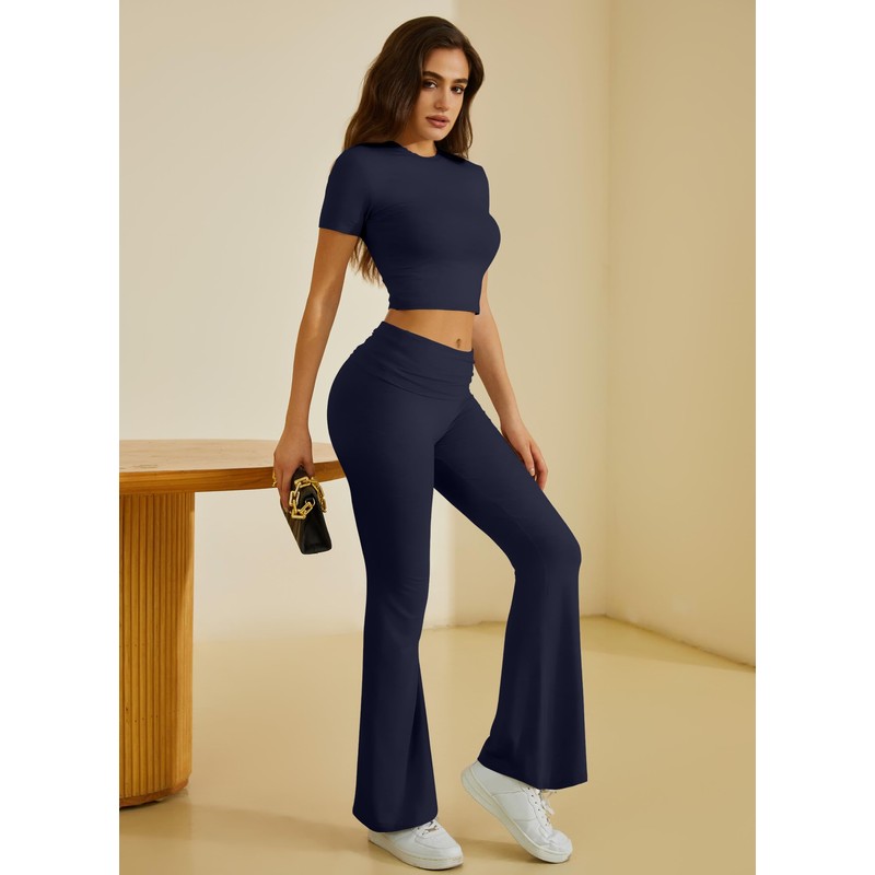 COPYLEAF Two Piece Lounge Sets for Women Fold Over Flare Pants Short Sleeve Crop Top Y2k Outfits Matching Set Tracksuit(Navy Blue XS)