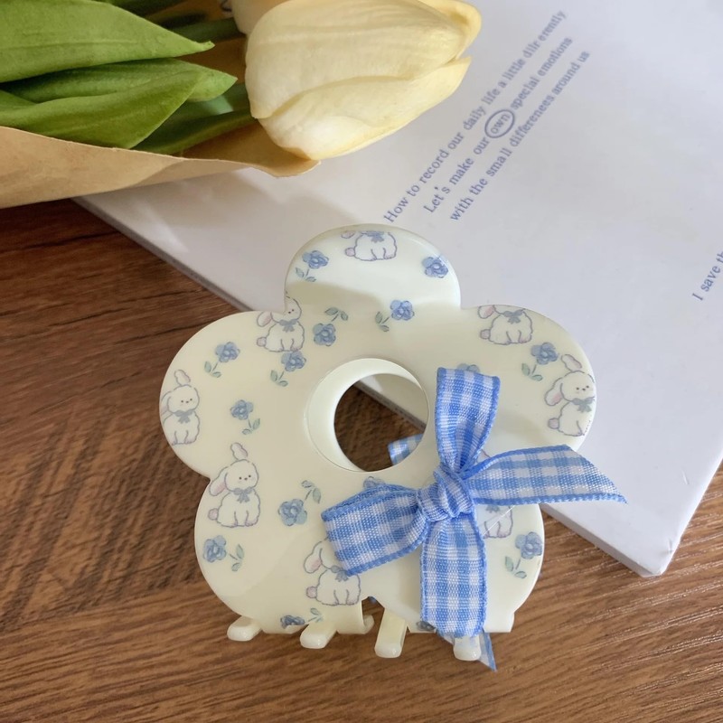 Coquette Floral Patterned Hair Claw Clip with Bows, Blue Floral with Bunnies, Flower Shaped