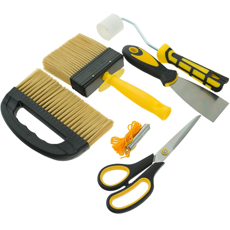 - This 6 piece wallpaper tool set offers excellent value for money. Set includes a Paste Brush, a Smoothing Brush, Seam Roller, Scissors, a Stripping Knife and a Plumb Bob & Line.