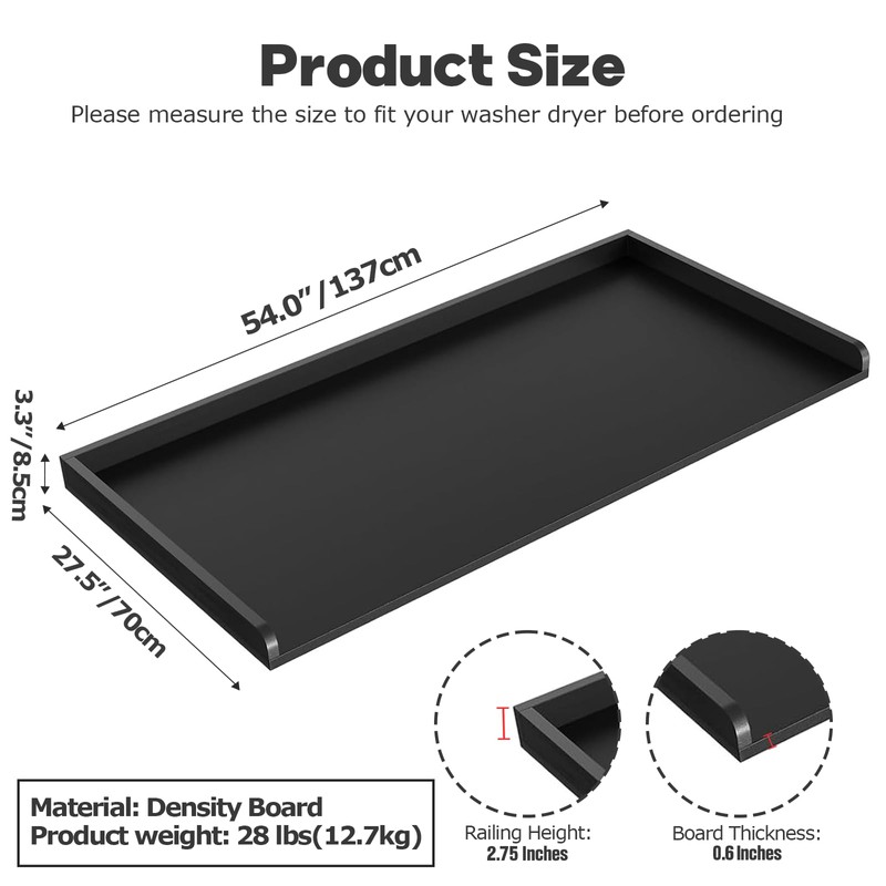 - 【Easy to Assemble】This sturdy laundry topper for washers and dryers is crafted from 0.6" thick engineered wood and weighs 28 lbs for enhanced stability and durability. Measuring 54 inches wide by 27.55 inches deep, it fits most standard front-load washers and dryers. Assembly is quick and easy with the included instructions.