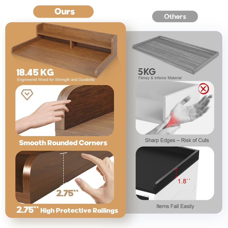 - 【2.75" High Railings to Prevent Items from Falling】Corbyles washer dryer countertop features 2.75" high guard rails on both sides and the back to prevent items from sliding off. Whether it’s detergent bottles, folded clothes, or small essentials, you won’t have to worry about anything slipping through the gaps. Plus, the smooth, rounded edges help minimize accidental bumps and scratches.