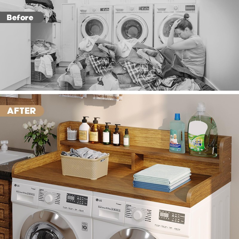 - 【Folding Laundry with Ease and Extra Storage】No more struggling with cramped laundry spaces—Our washer dryer topper offers a spacious, smooth surface for effortless folding, sorting, and organizing clothes. Plus, the 2-tier shelf keeps your laundry essentials neatly stored and within reach, helping you maintain a tidy, organized space.