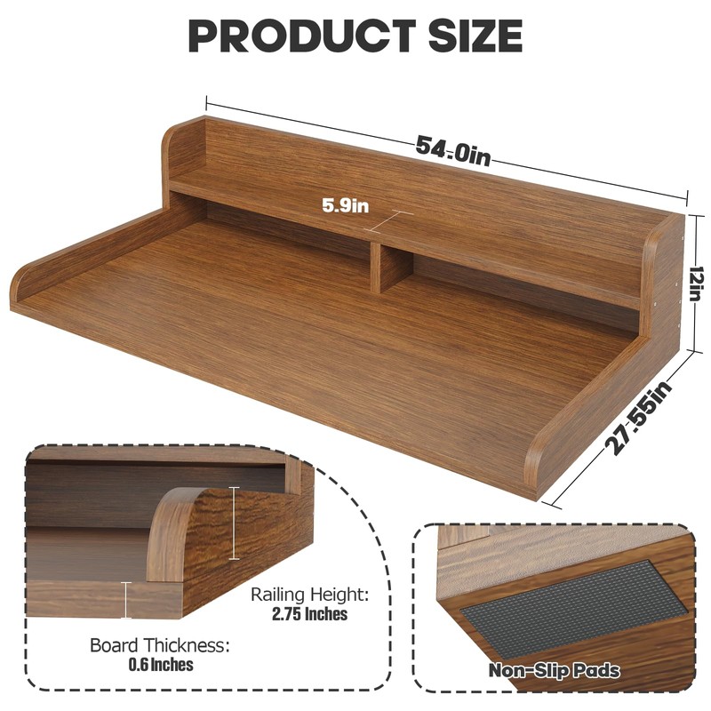 Corbyles 2-Tier Washer Dryer Countertop with 2.75" H Edge Rails, 54" W x 27.55" D Laundry Countertop for Folding Clothes, Washer and Dryer Topper with Non-Slip Pad (Brown)