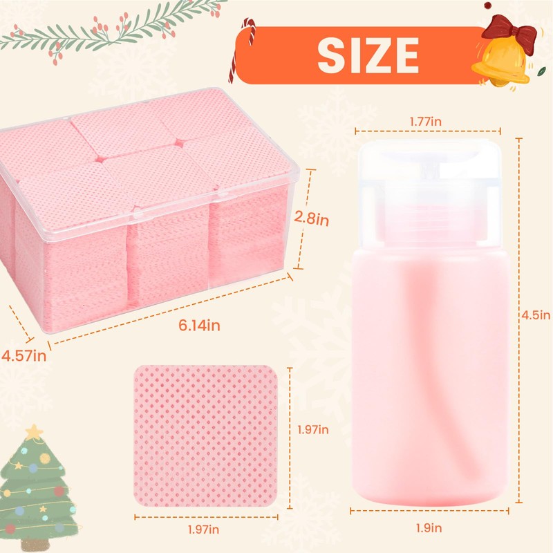 - 1080 Lint Free Nail Wipes With Dispenser : This nail care kit includes 1080pcs lint free nail wipes in a big dustproof plastic containers and 2pcs nail polish remover dispensers. You can pour acetone in one bottle and alcohol in the other.Perfect for daily home use and professional salon applications.