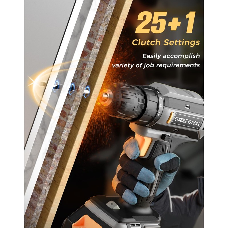 - Power Drill: This drill not only comes with a high-capacity 2000mAh power pack but also features 25+1 torque settings (Max 370 inch-pounds), enabling precise tightening/loosening of screws and providing more precise control. It prevents screw stripping and can easily drill into wood, ceramic, plastic, and even metal.