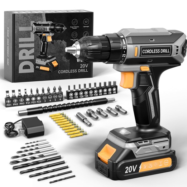 Cordless Drill, 20V MAX Power Drill Set with 2.0Ah Power Pack & Charger, 3/8 Inch Keyless Chuck, Variable Speed, 25+1 Position and 56PCS Bits/Screws, Power Tools for Home Projects