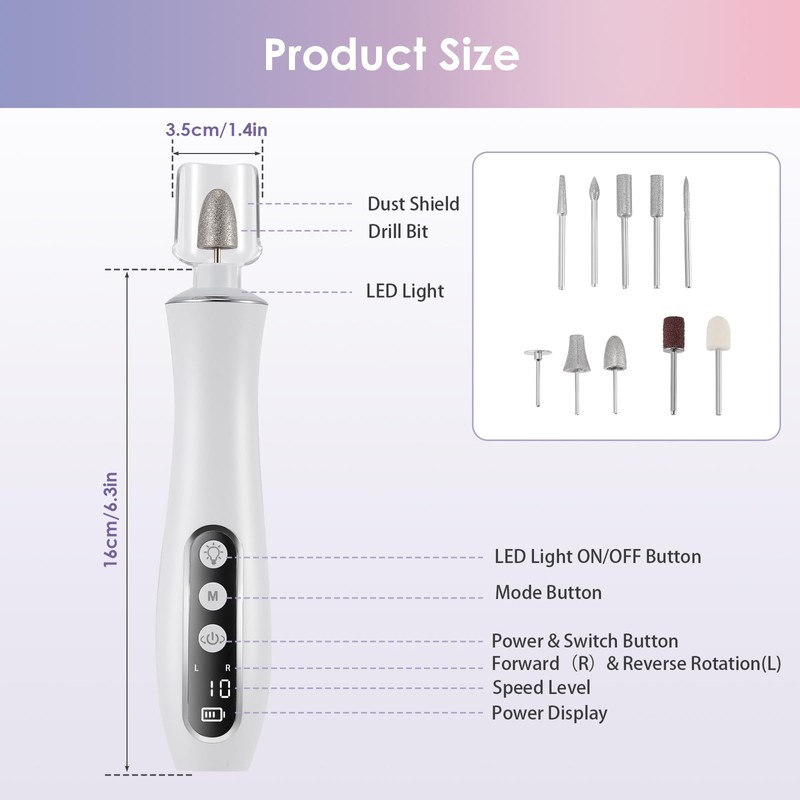 - Memory Function& Ergonomic: Easily switch directions with a long press of the button, and enjoy the convenience of the memory function that saves your last-used speed mode. Crafted for comfort, this nail drill boasts an ergonomic handle and minimal vibration, reducing hand fatigue during extended use. Its protective cap and beautiful storage case ensure portability and longevity.