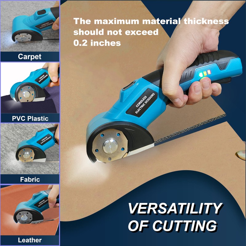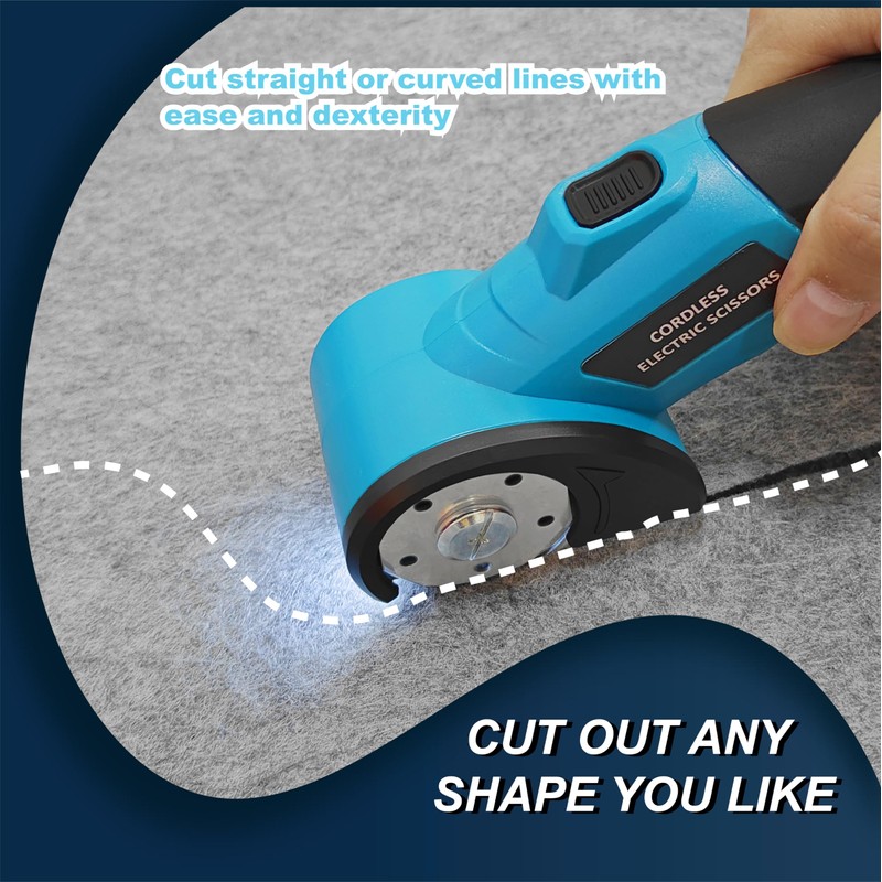 - 【Multi-functional Material Cutting】This cordless electric scissors is ideal for handicrafts, sewing, and professional use, making cutting tasks easy and precise. Suitable for cutting fabrics, 4mm cardboard, leather, plastic, wallpaper, carpets, and other materials