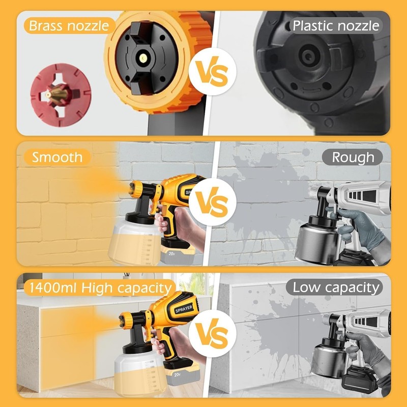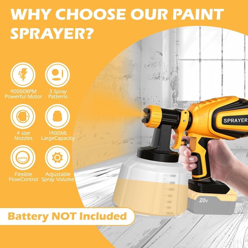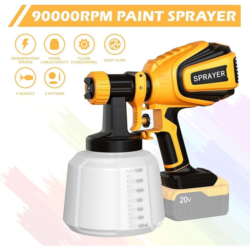 - The cordless paint sprayer operates at 90000 RPM with a large capacity container,enhancing painting efficiency;Its adjustable flow control adapts to various tasks,providing a faster and more convenient alternative to rollers and brushes