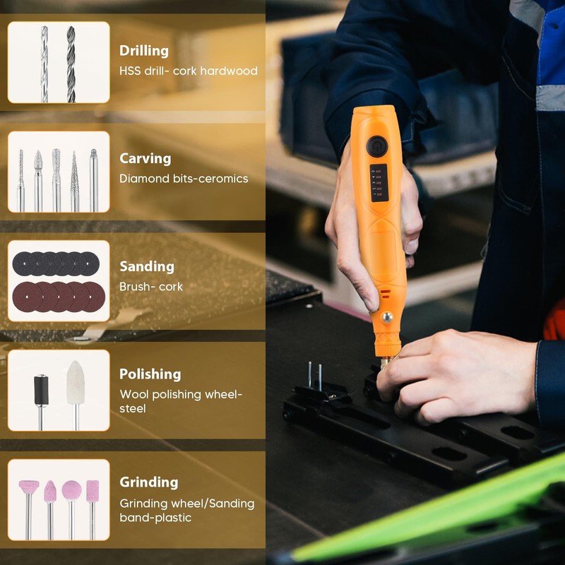 - 👒【105pcs Multifunctional Accessories】:The mini rotary tool comes with 105pcs accessories, conveniently stored in a transparent storage box. This allows for easy organization, grouping, and portability of various small parts. The tool is suitable for grinding, polishing, cutting, milling, drilling, deburring, sanding, cleaning, engraving, trimming, and more. With these accessories, you can efficiently complete different processing tasks.